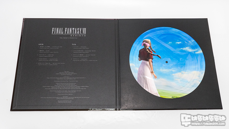자켓 전면에 인쇄는 유광으로 남자 캐릭터 세리로스, 클라우드 잭스 3인을 메인으로 하며 픽쳐 디스크 A, B면에는 티파와 에어리스 여자 캐릭터 2인의 뒷모습으로 뭔가 애틋함을 표현하고 있습니다.