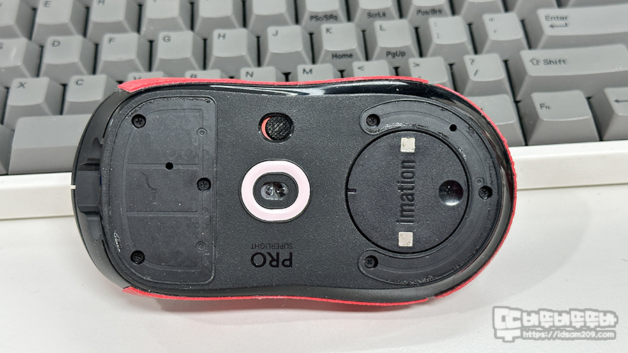 마우스 분해를 위해서는 앞쪽에 넓은 피트와 뒤쪽 부분에 반원형 피트를 제거하여 나사 구멍이 보여야 하는데 순정 피트를 사용한다면 이중 구조로 되어있기에 겉 부분의 테프론 피트와 안쪽 부분에 쿠션감 있는 우레탄 피트까지 모두 제거해야 나사 구멍을 보게 되니 잘 제거해 주세요.