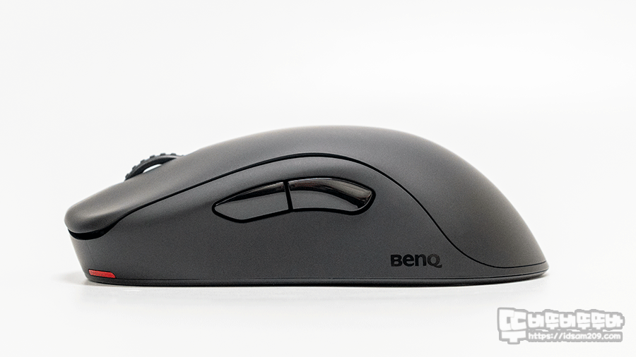 전체적으로 보면 앞쪽에 좁고 뒤쪽이 넓은 디자인으로 편안한 그립감을 위한 노하우가 적용되어 마우스 그립 시 엄지손가락을 비롯한 사이드 그립을 담당하는 손가락이 마우스 안쪽을 파고드는 움켜지는 그립으로 사용되네요.
