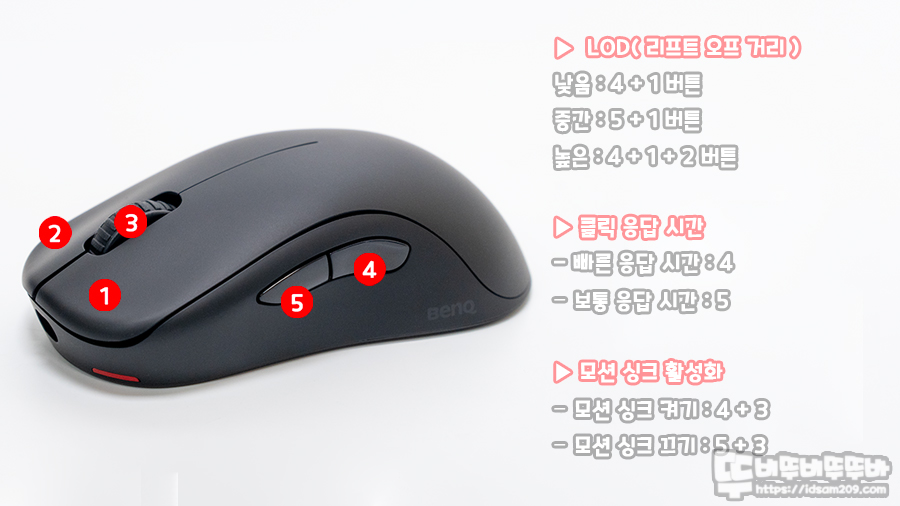 그 외 LOD, 클릭 응답시간, 모션 싱크 활성화는 전원을 켜기 전에 유선 사용의 경우 USB를 연결하기 전에 해당 버튼을 누른 후 전원 On 또는 USB 연결 시 설정이 가능한데 문제는 기능이 설정되었는지 따로 표현되는 부분이 없어 답답함이 있습니다.