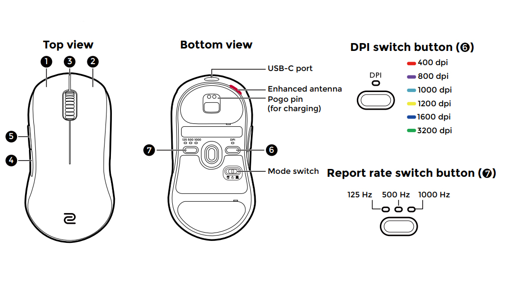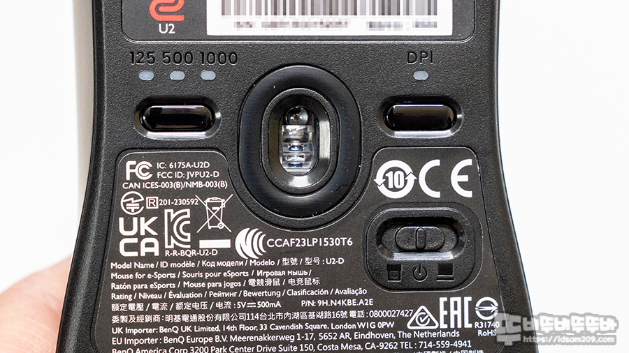 벤큐 조위 U2 마우스는 기존의 제품과 비슷하게 바닥면에 USB 폴링 레이트, DPI를 조절할 수 있으며 조절되는 부분을 LED 인디케이터로 확인이 가능한데요.