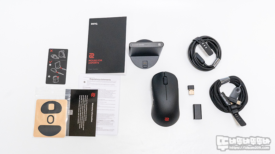 제품의 구성은 벤큐 조위 U2 무선 게이밍 마우스 본체, 무선 리시버 겸 충전 독, 무선 리시버, 리시버 익스텐드, PVC & 파라코드 USB-C to A 케이블 2종, 사용 설명서, 여분의 마우스 피트 등으로 구성되어 있는데요.