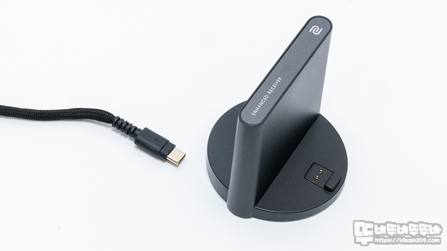 USB-A 무선 리시버보다는 확장된 신호로 안정적인 사용을 지원하는 충전 거치 겸 무선 리시버는 무선 연결 시 연결되었다는 표시와 무선 이어폰과 같은 자석 방식으로 근처에 갖다 대면 척하며 부착되면서 충전되는 편리함을 제공하는데요.