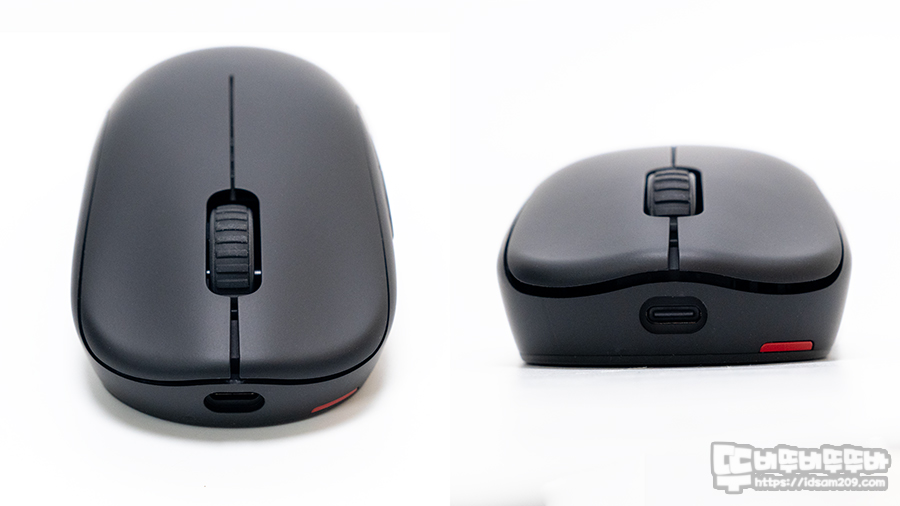 마우스 전면 부를 살펴보면 EC2-CW와 같이 투박하게 돌출하지 않고 깔끔하게 디자인된 USB-C 단자 모습과 무선 수신율을 생각하여 전면에 노출된 안테바 파트(레드 컬러)를 확인할 수 있습니다.
