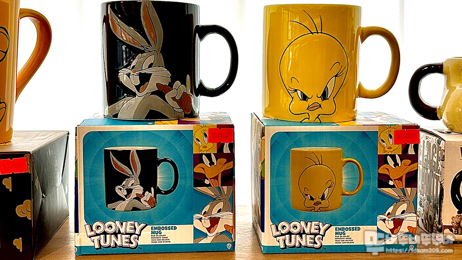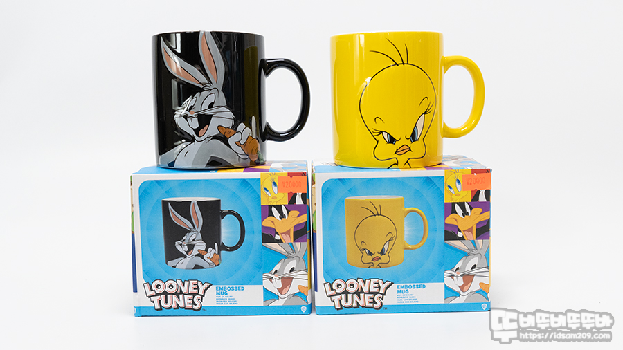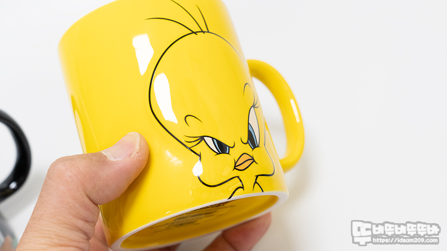 특별하진 않지만 머그컵에 캐릭터가 엠보싱으로 디자인되어 살짝 튀어나온 느낌으로 벅스 바니와 트위티 파이의 캐릭터 특징이 매력 포인트로 표현되었습니다. 그래서 눈에 끌렸다는..