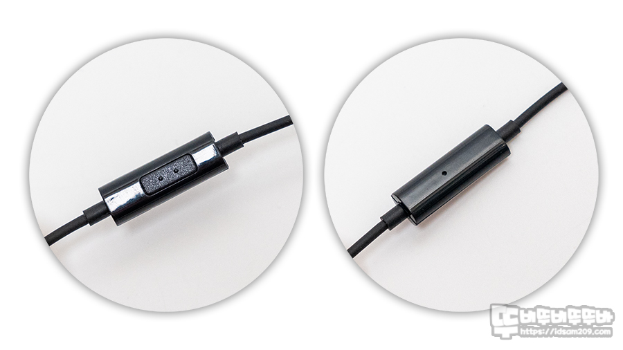 오른쪽 헤더가 연결된 케이블 중간에 위치한 원 버튼 컨트롤러가 있어 기기의 프로그램에 따라 다르겠지만 원클릭 더블클릭 형태로 컨트롤이 가능하며 컨트롤 버튼 뒷면에는 ECM 마이크가 내장된 마이크 홀이 있으니 마이크 사용 시에는 마이크의 위치를 확인하시는 게 좋습니다.