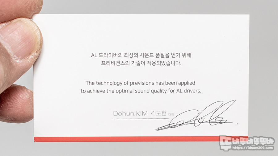 제품은 드라이버 C 이어폰과 여분의 이어팁 그리고 PROJECT REFINE와 프리비젼스 튜닝 기술이 적용되었다는 사운드의 대가 권도헌 대표님의 사운드 보증서 같은 카드가 포함되어 있습니다.