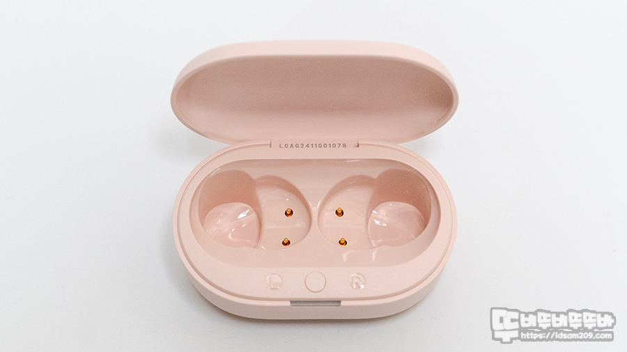 케이스를 오픈했을 때 중앙에 페어링 버튼 그리고 좌우를 구분하는 L, R 표기를 확인할 수 있습니다.