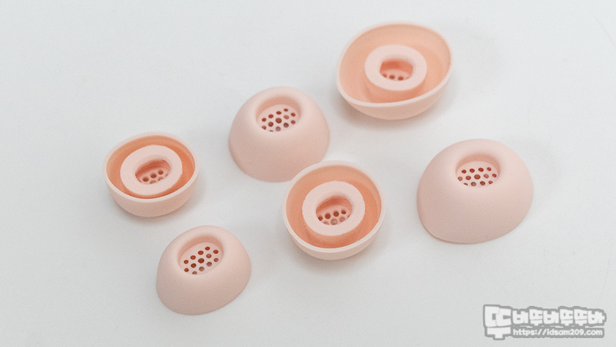 기본으로 제공되는 실리콘 이어팁은 중간 사이즈가 이어버드의 기본으로 장착되어 있으며 그 외로 작은 사이즈와 큰 사이즈를 제공하며 실리콘 이어팁이 부착되는 이어버드 끝부분에는 돌기가 있어 이어팁이 회전하는 것을 방지해 줍니다.