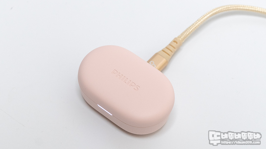 슬림한 디자인의 필립스 TAT1209 무선이어폰 충전 케이스는 편리한 충전을 위해 USB-C 단자를 사용하고 있으며 전면에는 배터리 잔량 및 충전 상태를 표현하는 LED 인디케이터가 위치하고 있습니다.