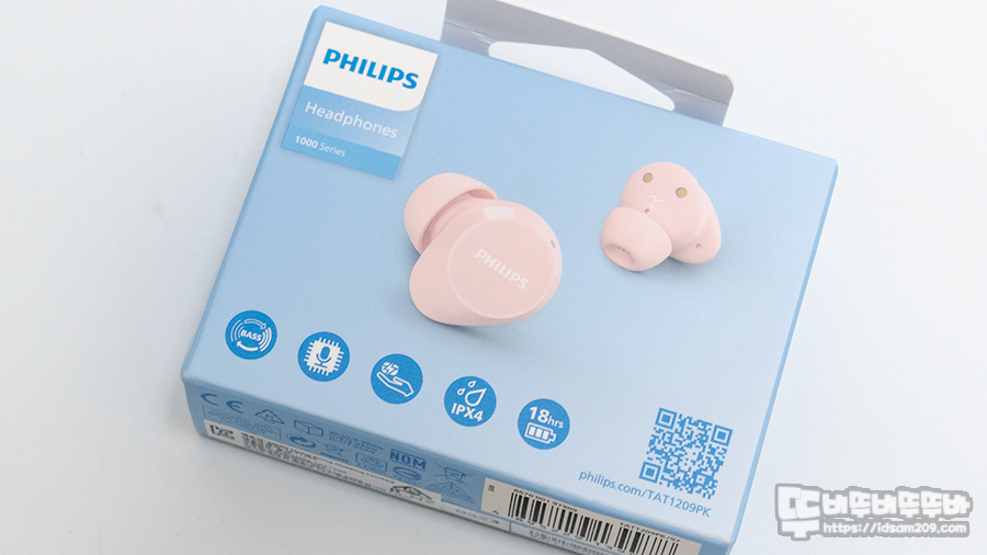 필립스 TAT1209 무선이어폰 패키지에는 제품의 이미지와 베이스 강화, 선명한 음성 통화, 가벼운 무게, IPX4 생활 방수 지원, 최대 18시간 사용 등에 대한 정보가 인쇄되어 있고요.