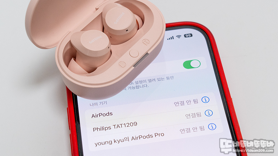 기기 페어링은 스마트폰의 블루투스 기기 리스트에 등장하는 Philips TAT1209를 선택하면 페어링이 완료되면 최초 페어링 이후에는 케이스에서 꺼내면 오토 페어링으로 사용하게 됩니다.