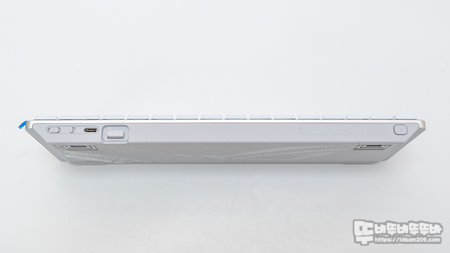 메인 회로가 내장되어 있을 법한 키보드 상단부는 무선/유선 사용을 선택할 수 있는 셀렉트 스위치, OS 선택 스위치 USB-C 충전 포트, 무선 리시버 수납부 그리고 반대편에는 멀티 션 버튼과 터치 센서가 내장된 것을 확인할 수 있습니다.