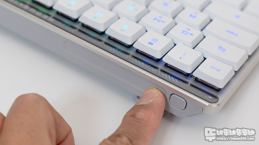 키보드 왼쪽 상단의 정전 센서를 터치하여 조작 가능한 터치 바는 기능 버튼을 눌러 시스템 볼륨 / 미디어 트랙 / 키보드 밝기 조정 / 사용자 지정 가능하여 사용 범위는 양각으로 표현된 도트 범위 내에서 사용이 가능하고요.