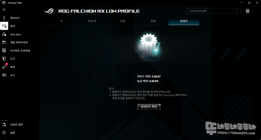 마지막 펌웨어 메뉴는 현재 버전 표시와 최신 펌웨어 버전을 Armoury Crate의 업데이트 메뉴를 통해 확인할 수 있는데요.
