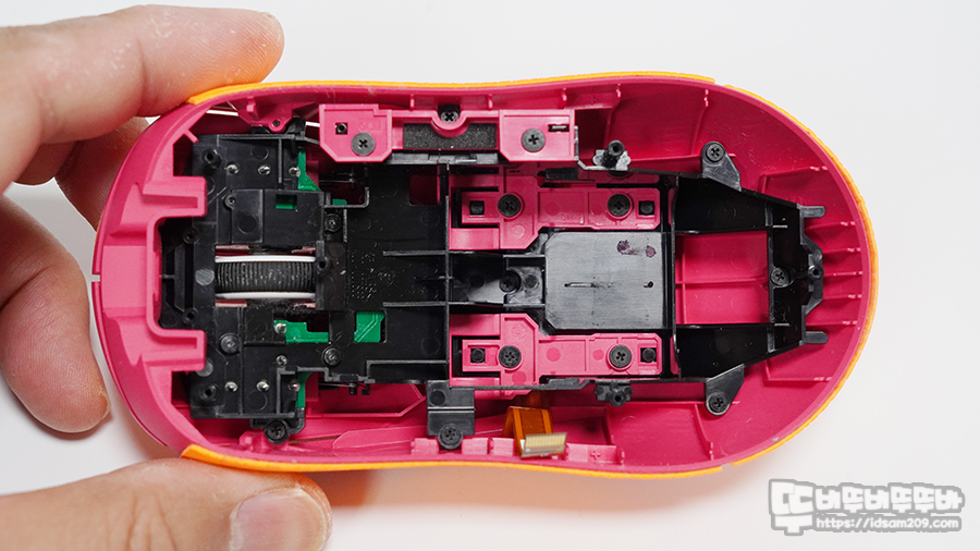 양면테이프로 부착된 건전지를 떼내고 좌우 클릭 부 하우징 고정 나사 (좌/우 2개씩) 총 4개를 분리합니다.