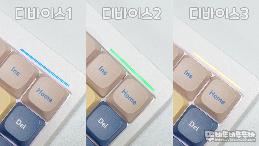 몬스타기어 MK84S는 3대까지 등록이 가능한 멀티페어링을 지원하여 PC, 노트북, 스마트폰 등 등록으로 편리하게 사용할 수 있는데 디바이스 1(1번-Blue), 디바이스 2 (2번-Green), 디바이스 3(3번-Yellow)로 LED 인디케이터 구분되며 해당 번호에 기기가 등록되면 해당되는 LED를 표현하는데 디바이스를 전환할 땐 선택한 디바이스의 LED 인디케이터가 점멸하며 약 3~5초 내외에 전환이 완료되면 점등으로 표현되니 블루투스 멀티 페어링 시 디바이스 전환 시 LED 인디케이터를 잘 확인하시기 바랍니다.