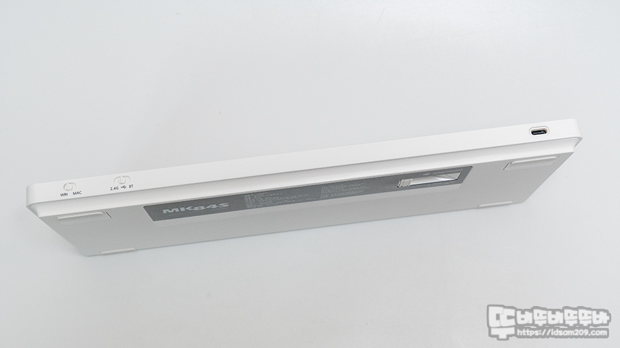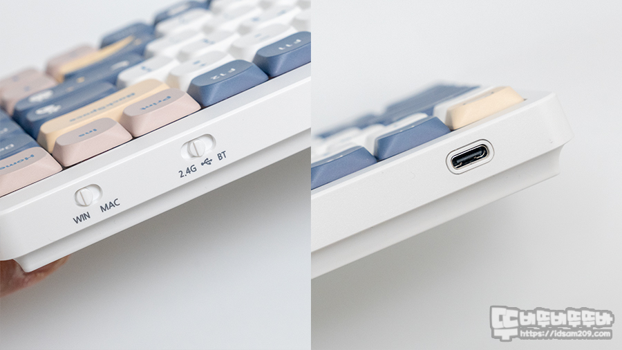 키보드 상단에는 Window & MAC OS 선택 버튼, RF 2.4GHz / 유선 / 블루투스 입력 선택 버튼, 유선과 충전이 가능한 USB-C 단자로 구성되어 있어 다양한 상황에 맞게 사용이 가능합니다.