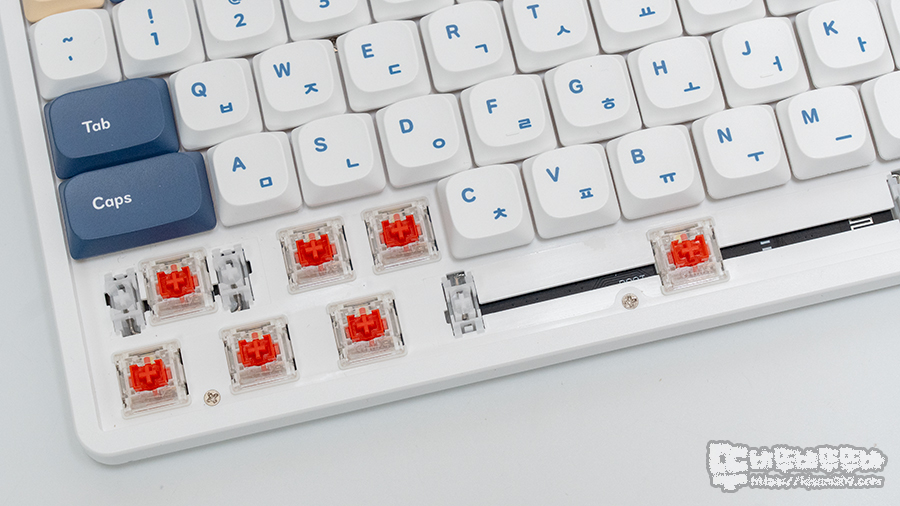 오테뮤 LP 스위치는 방청 슬라이드가 적용되었으며 하우징과 일체 된 플라스틱 소재의 보강판 그리고 보강판에 고정된 체리 방식의 스테빌라이저 모습도 확인할 수 있습니다.
