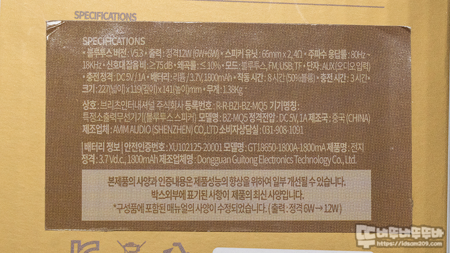 6W+6W=12W 출력, 66mm 드라이버 유닛 2개 사용, 블루투스/USB/MicroSD카드/FM라디오/AUX/시계&알람 기능 지원, 1800mAh 배터리 내장, 충전시간 3시간, 사용시간 약 8시간, 크기 가로 227 X 세로 119 X 높이 141mm, 무게 1.38kg 등의 정보를 확인할 수 있습니다.