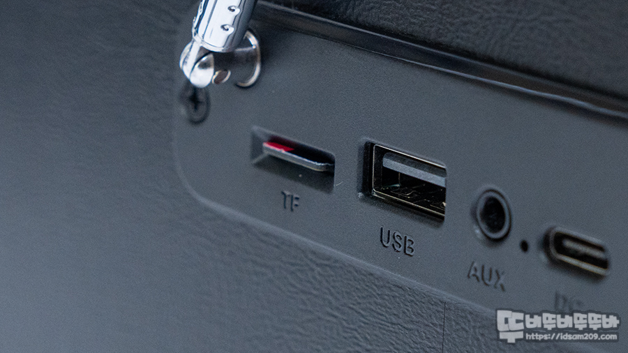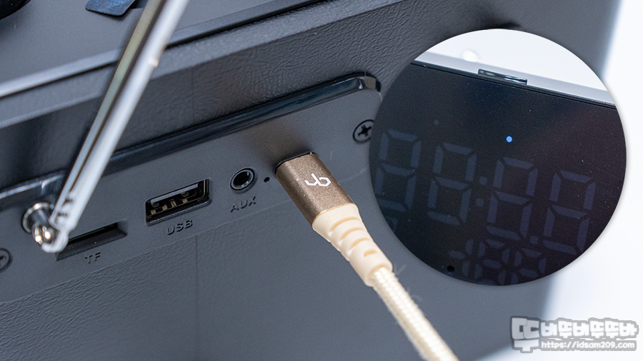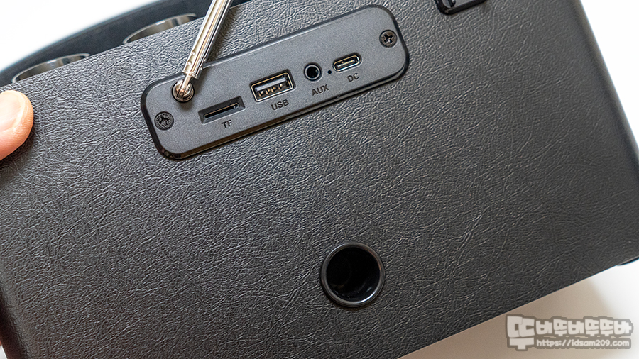 제품 뒷면에는 회전이 가능한 텔레스코프 FM 안테나 그리고 TF(MicroSD) 슬롯, USB-A 단자, AUX 입력 단자, USB-C 충전 단자 그리고 MDF 인클저 내부의 울림이 해소하는 에어덕트 모습을 확인할 수 있습니다.