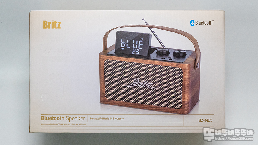 Britz 브리츠 BZ-MQ5 블루투스 스피커 패키지는 다양한 기능인 블루투스, FM 라디오, 시계/알람, MicroSD 및 USB 메모리 재생, AUX 입력, 디지털 온도계 등의 기능을 지원하는 내용을 확인할 수 있고요.