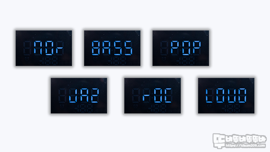 EQ 사운드는 Normal - Bass - POP - JAZ - Rock - Loud 순으로 선택할 수 있으며 재생되는 사운드의 음색에 따라 EQ 적용으로 다이나믹한 사운드를 경험할 수 있으니 잘 활용하시기 바랍니다.
