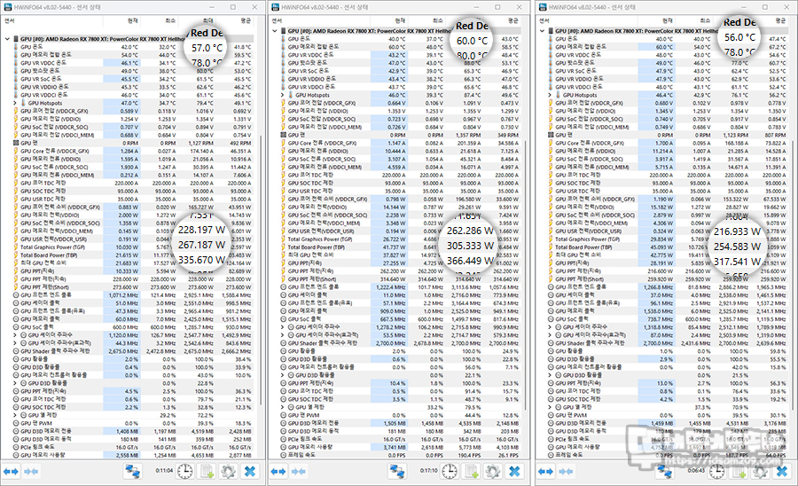 HWiNFO64로 정보를 살펴보면 전력 제한 설정에 따라 온도와 소모되는 전력이 차이가 있음을 확인할 수 있는데 프레임 상승의 퍼포먼스 또는 적정의 소비전력과 퍼포먼스를 선택할 수 있으니 본인만의 적정선을 찾으시기 바랍니다.