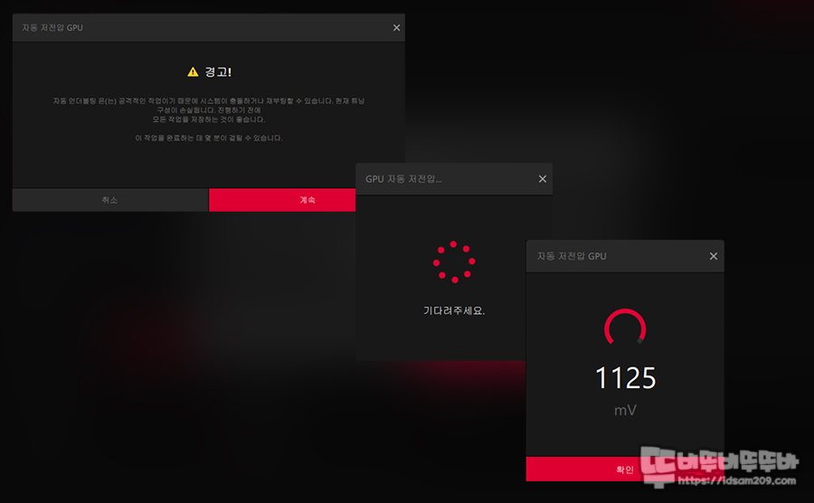 보기에 어려워 보이지만 마우스로 클릭하면 되는 간편함을 제공하기에 라데온의 언더볼팅은 자동 튜닝에 저전압 GPU / 오버클럭 GPU / 오버클럭 VRAM 순으로 선택하여 자동으로 튜닝되는 값을 먼저 확인해 주셔야 합니다.