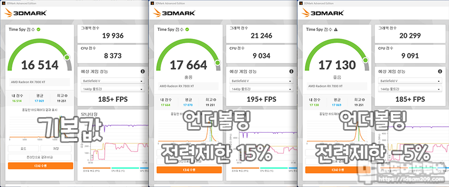 위의 설정값을 적용하여 3D MARK - Time Spy를 돌려보면 그래픽 카드 기본 값 설정 시 그래픽 카드 점수 19,936점, 설정값으로 언더볼팅 후 전력제한 최대치 설정 시 그래픽 카드 점수 21,246점, 전력제한 -5% 설정 시 20,299점으로 성능 편차를 확인할 수 있는데요.