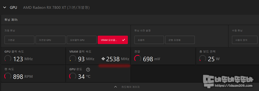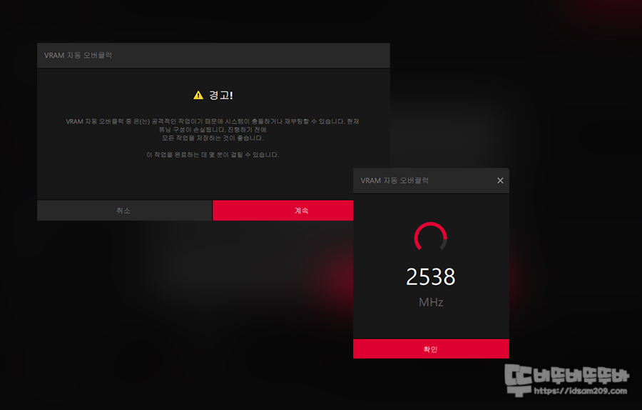 VRAM 튜닝 활성화 / 고급 제어 활성화 - 오버클럭 VRAM 값 2538MHz 입력.