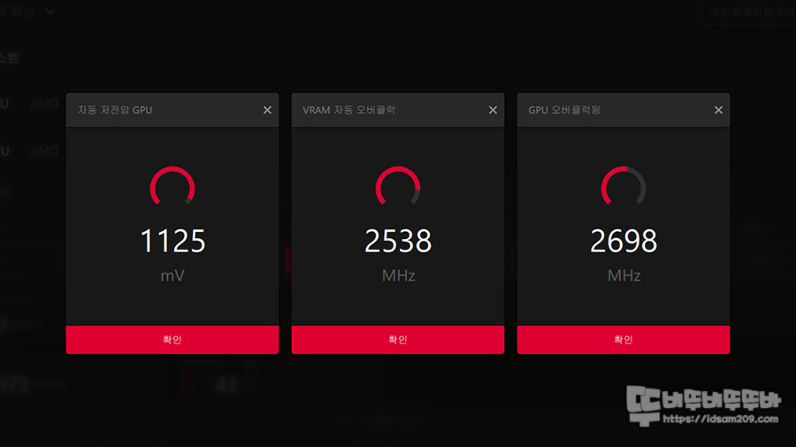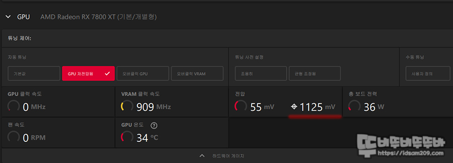 보기에 어려워 보이지만 마우스로 클릭하면 되는 간편함을 제공하기에 라데온의 언더볼팅은 자동 튜닝에 저전압 GPU / 오버클럭 GPU / 오버클럭 VRAM 순으로 선택하여 자동으로 튜닝되는 값을 먼저 확인해 주셔야 합니다.