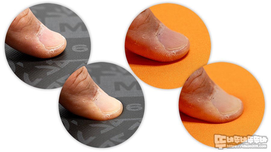 마우스 패드 앞뒤면을 손가락을 꾹꾹 눌러보면 6mm 두께감을 확실하게 체감할 수 있는데 책상과 마우스에 약간의 티끌이 있어도 표면에 느껴지지 않더라고요.