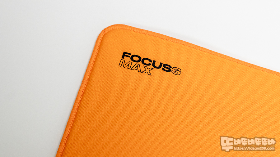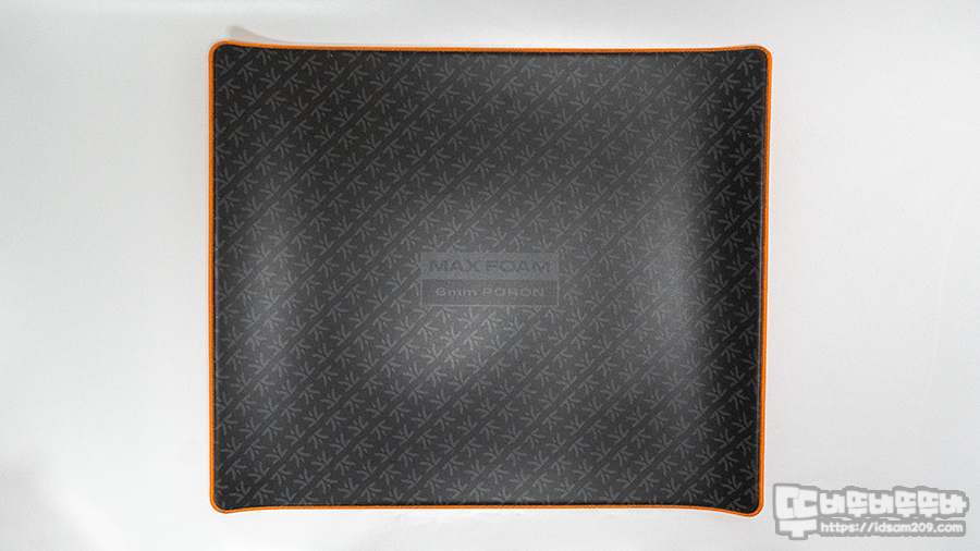 오렌지 컬러로 디자인된 패드 표면에는 대각선 방향 모서리에 제품의 모델명과 로고가 고무나염방식으로 인쇄되어 있습니다만 마우스 활공에 영향을 주는 영역이 아니기에 게임을 하는데 영향을 주진 않습니다.