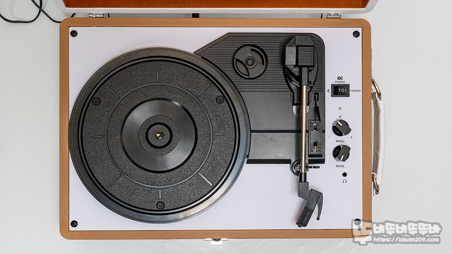 브리츠 BZ-TP4000 뚜껑을 열어보면 심플한 턴테이블 구조를 확인할 수 있는데 LP를 재생할 때 LP 먼지 유입을 방지하는 더스트 커버로 활용이 불가능한 가방형 디자인은 LP가 살짝 튀어나온 상태로 플레이되기에 항상 뚜껑을 오픈하고 사용해야 합니다.