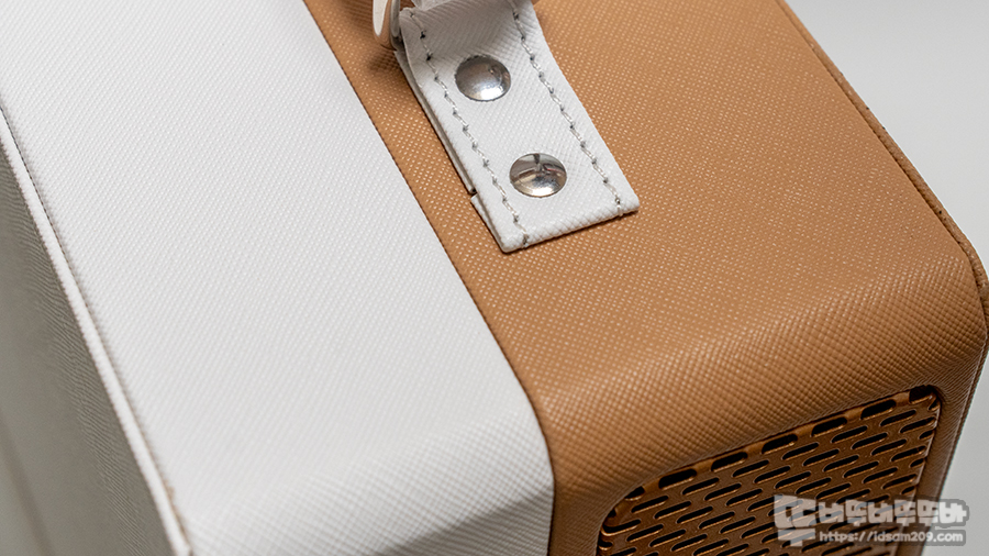 브리츠 BZ-TP4000은 MDF 베이스에 인조가죽을 사용한 휴대용 가방 형태로 디자인되어 꽤 심플한데 인조가죽으로 사용하고 있어 표면의 이염 또는 오염이 발생할 수 있지만 그런 상황이 온다면 빈티지 느낌을 줄 거 같습니다.