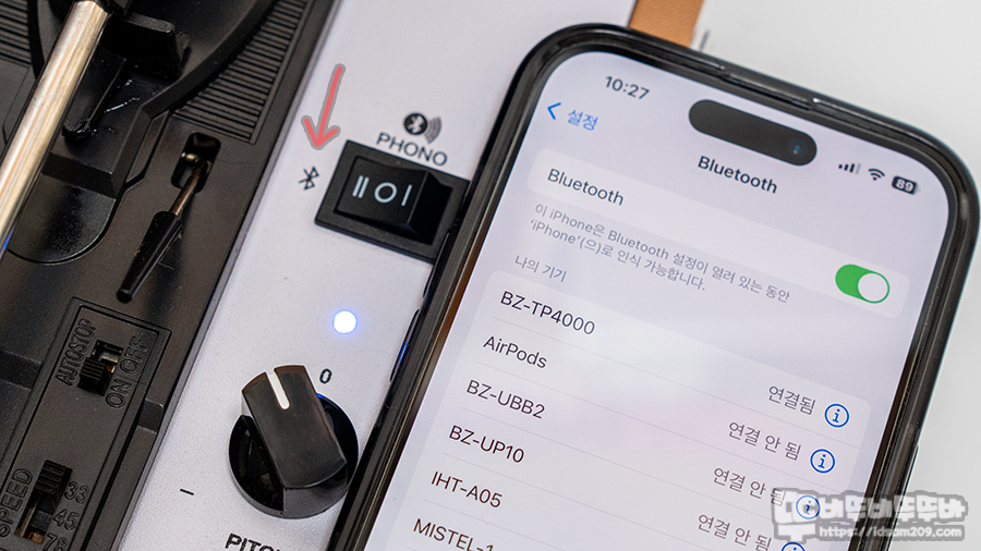 블루투스 스피커 모드를 스위치를 선택하고 스마트폰의 블루투스 기기 리스트에 등장하는 BZ-TP4000를 선택하면 스마트폰의 사운드를 턴테이블 내장 사운드로 음악 감상이 가능하며 마지막으로 제품 후면의 AUX in 단자로 외부 사운드 입력으로 사용하는 경우 제품의 재생 모드 스위치 사용이 불가능합니다.
