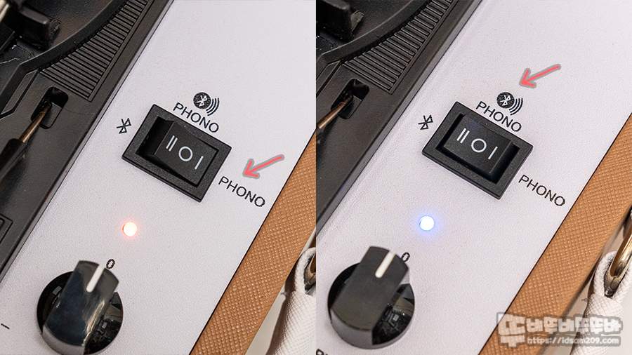 LED 인디케이터는 Phono 모드일 때 레드, 블루투스 관련 모드의 경우 블루, 외부 입력 모드 시 퍼플 컬러로 구분하여 작동상태에 대한 구분이 가능합니다.