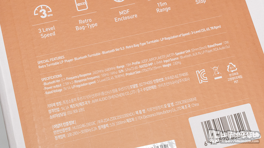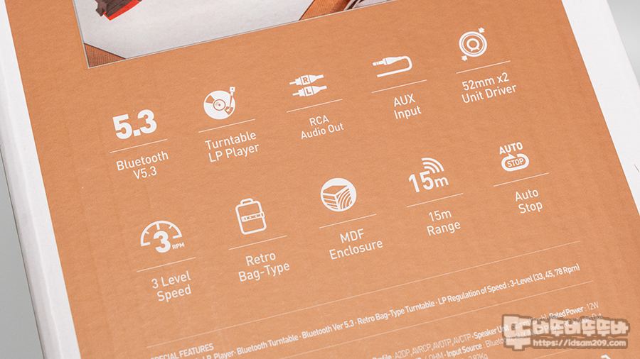 블루투스 5.3 / 턴테이블 / RCA 출력 / 3.5mm AUX 입력 / 52mm X 2 드라이버 유닛 / 33, 44, 78 3단계 속도 지원 / 레트로 백 타입 / MDF 인클저 / 블루투스 사용 시 15m 거리 가능 / 오토 스톱 기능 지원 등의 내용을 확인할 수 있습니다.