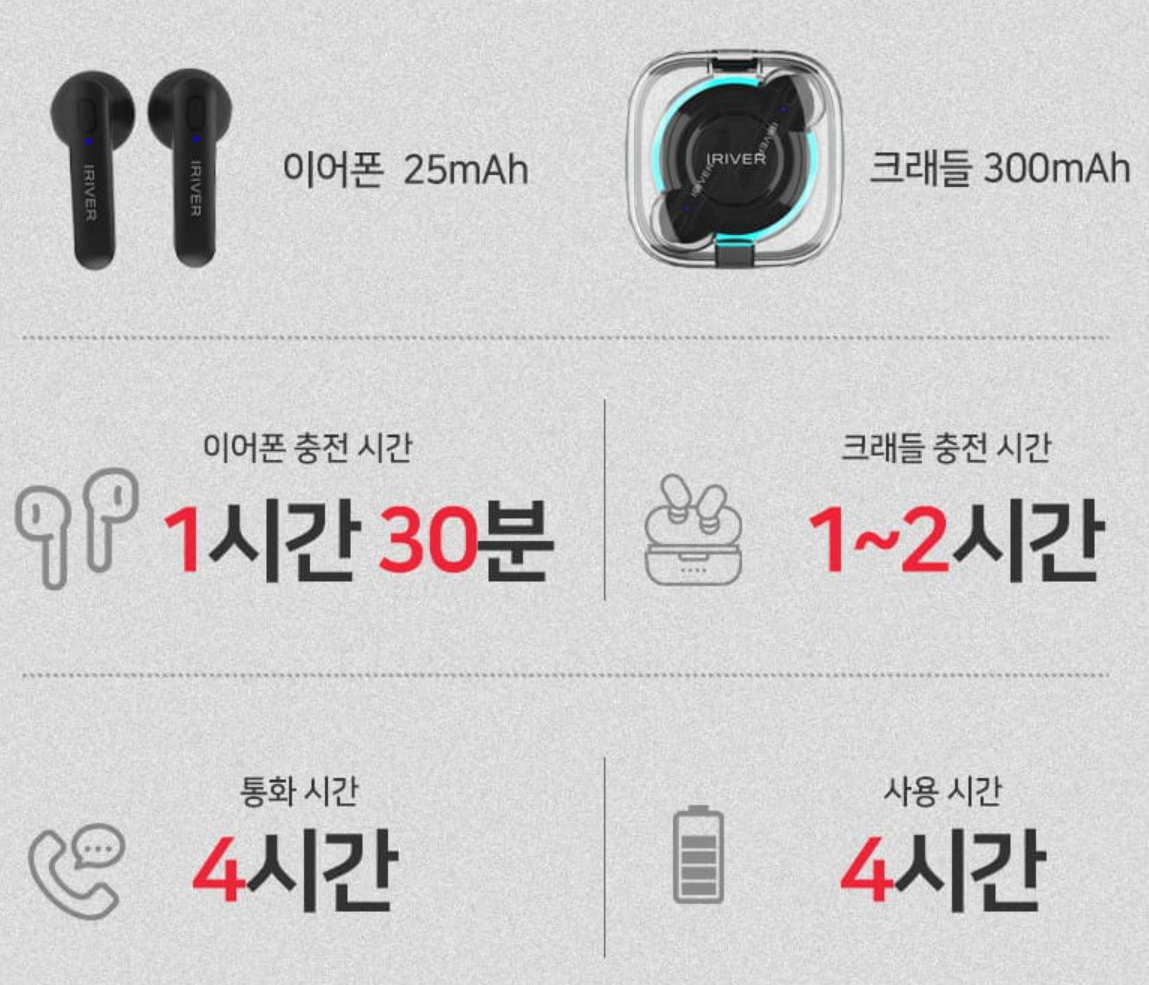이어버드 완충은 약 1시간 30분 소요되며 완충 시 약 4시간 사용이 가능합니다.