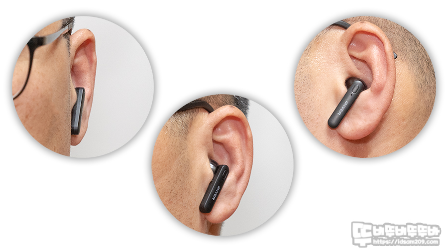 오랜만에 오픈형 이어버드를 착용해 보는데 생각보다 헐렁한? 귀에 꽉 차지 않는 느낌으로 귀 안쪽의 연골을 압박하거나 눌리는 게 없어 착용이 편안했습니다.