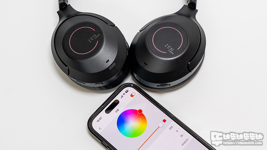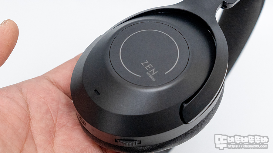 양쪽 이어컵 바깥쪽은 전용 앱을 사용했을 때 LED 효과를 표현하는 원형 디퓨저와 Zen Hybrid 로고 그리고 아래쪽에 액티브 노이즈 캔슬링과 앰비언트 모드를 위한 마이크 홀의 모습을 확인할 수 있습니다.