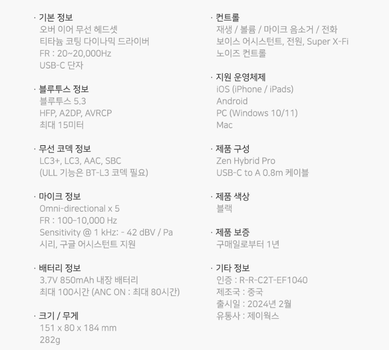 티타늄 코팅 40mm 드라이버 유닛, 블루투스 버전 5.3, LC3+, LC3, AAC, SBC 코텍 지원, 5개의 마이크, 850mAh 배터리 내장으로 ANC Off 시 100시간 On 시 80시간 사용 등의 정보를 확인할 수 있고요.