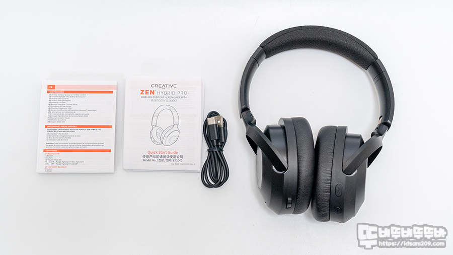 제품은 ZEN HYBRID PRO LC3+ 블루투스 헤드폰 본체, USB-C to A 충전 케이블, 사용 설명서로 구성되어 있습니다.