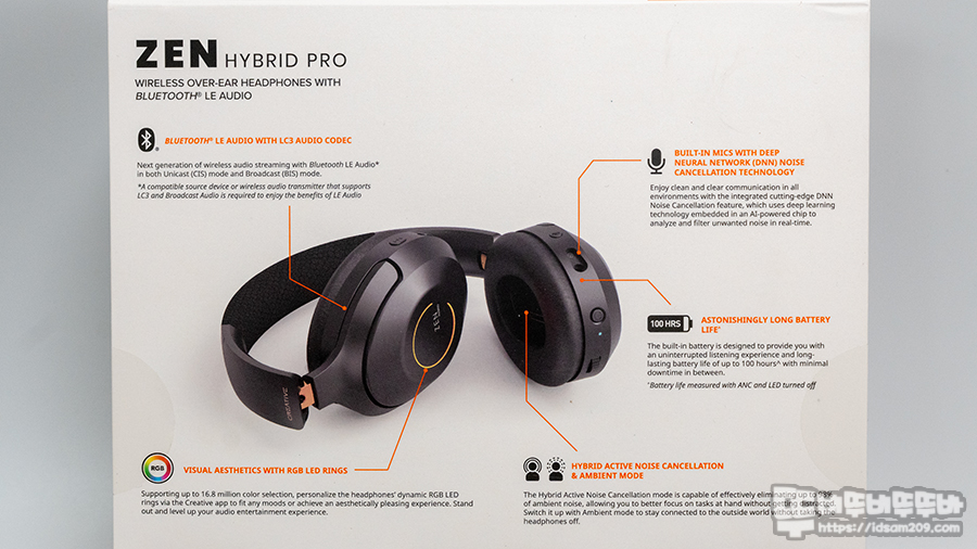 패키지 뒷면에는 블루투스 LE / LC3 코덱 지원에 대한 내용과 RGB 라이팅, 마이크, 100시간 사용 가능한 배터리 내장, 액티브 노이즈 캔슬링 및 앰비언트 사운드 지원에 대한 내용이 인쇄되어 있습니다.