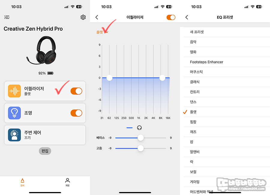 보통 앱을 이용한 EQ를 지원하는 제품을 사용해 보면 음의 변화가 밋밋해서 변화가 크게 체감되지 않는데 Creative 크리에이티브 ZEN HYBRID PRO LC3+ 블루투스 헤드폰은 음의 변화가 확확 변화되어 체감이 되니 취향 저격으로 설정할 수 있었습니다.