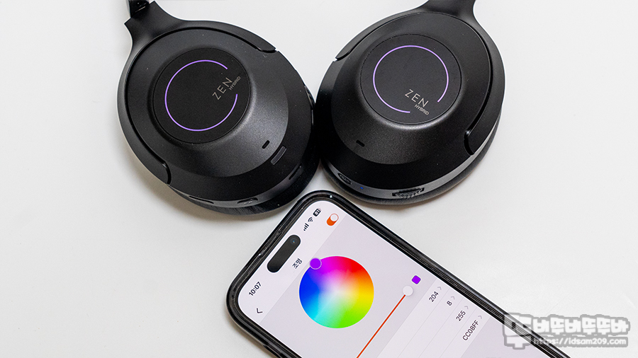 RGB 효과의 원형으로 표현되는 팔레트에서 직관적으로 컬러를 선택하거나 R, G, B, HEX 코드로 취향에 맞는 컬러 적용이 가능하고 주변 제어 메뉴를 통해서 ANC On/Off, 주변소리 듣기(Ambient) 선택 및 해당 기능의 레벨을 디테일하게 설정하여 사용할 수 있으며 특히 RGB 컬러의 경우 LED로 표현되기에 100% 일치되는 컬러로 표현되기보다 약간 물 빠진 컬러로 보일 수 있다는 점 참고하시기 바랍니다.