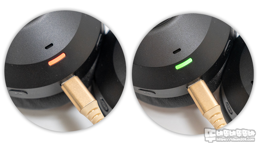 헤드폰을 충전 시 LED 인디케이터는 Red LED 점등으로 표현되며 완충 시 Green LED 점등으로 유지되어 충전이 완료 배터리 부족 시 Red LED 점멸로 표현하고요.