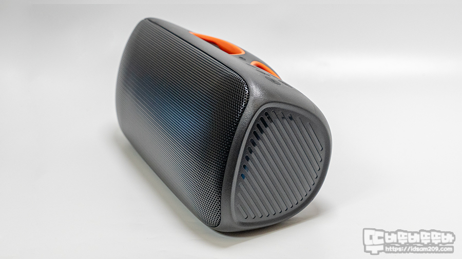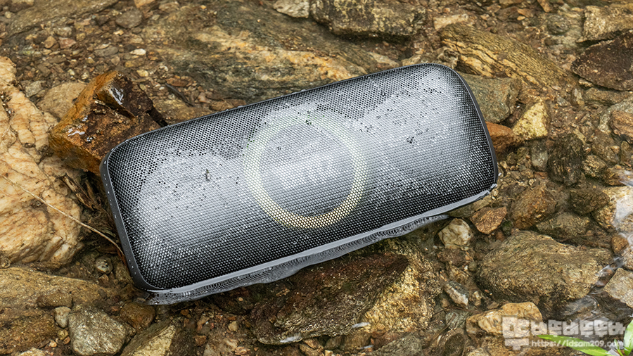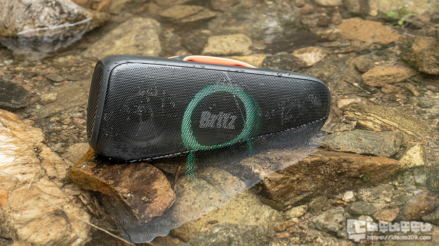 아무래도 스피커 무게가 스피커 유닛에 집중되어 있는 구조다 보니 스피커가 물에 잠기는 걸 기대하기보단 앞쪽으로 엎어지면서 물 위로 둥둥 떠다니는 형태가 되니 흐르는 냇가에서 사용한다면 떠내려가는 것을 주의하셔야 할 거 같습니다.