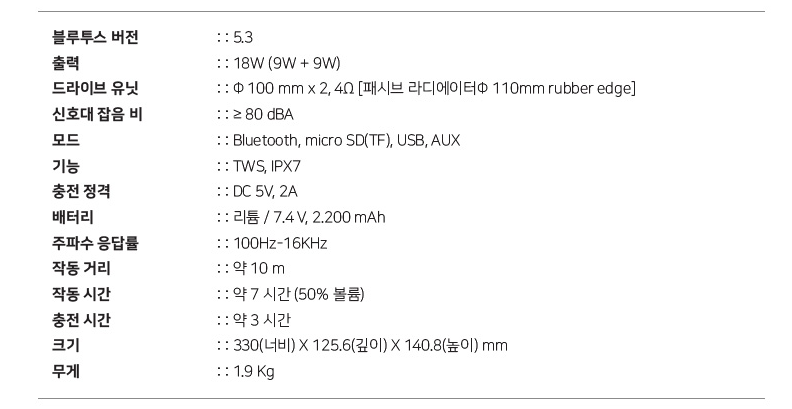 블루투스 버전 5.3, 100mm 드라이버 2개 각 9W+9W=18W 출력 (110mm 패시브 라디에이터), 입력 모드 : 블루투스, MicroSD, USB, AUX, TWS 지원, IPX7방수 지원, 2,200mAh 배터리 내장, 완충 시간 : 약 3시간, 사용시간 : 약 7시간 (50% 볼륨 기준), 크기 330mm X 12.5mm X 140.8mm, 무게 1.9kg 등의 정보를 확인할 수 있습니다.
